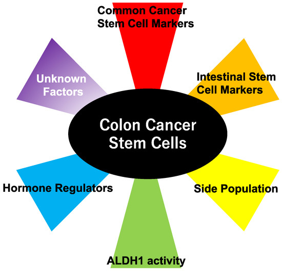 Various methods to detect colon cancer stem cells. Colon cancer stem cells are detectable on the basis of common cancer stem cell markers (Section 2.1), intestinal stem cell markers (Section 2.2 and Section 2.3), side population (Section 2.5), aldehyde dehydrogenase (ALDH1) activity (Section 2.6), and hormone regulators (Section 2.7). Considering the multifaceted nature of cancer stem cells, there must be unknown factors that mark cancer stem cells (for example, epithelial–mesenchymal transition (EMT) inducers, Section 2.4).