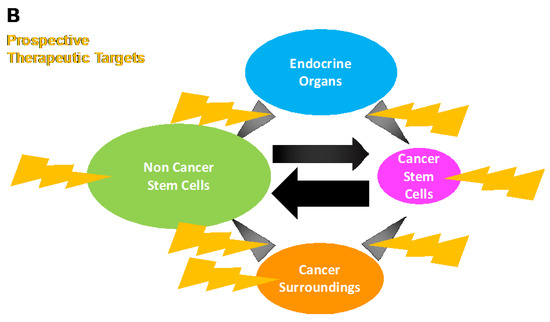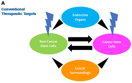 Conventional and prospective targets in cancer therapy: (A) Conventional therapy targets exclusively cancer cells without any distinction of cancer stemness. (B) On the other hand, prospective therapy involves microenvironment and endocrine status, which induce cancer stemness. Forced shrinking of cancer stem cell population by alteration of external signals is a possible approach for achieving complete response.
