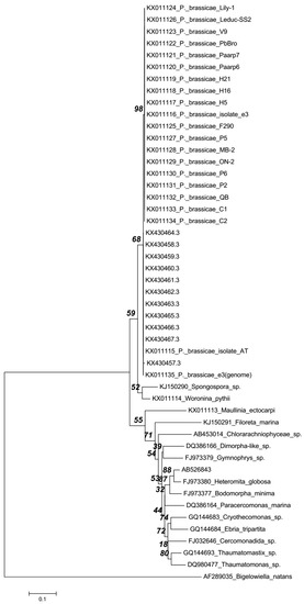 - Schwelm, A.; Berney, C.; Dixelius, C.; Bassc, D.; Neuhauser, S. The large subunit rDNA sequence of plasmodiophora brassicae does not contain intra-species polymorphism. Protist 2016, 167, 544–554. [Google Scholar] [CrossRef] [PubMed]