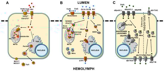| Divalent Metal Transporter 1 (DMT1, SLC11A2) | Fe | Divalent metals transport | Malvolio (Mvl) | [10,11] |