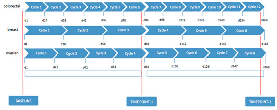 A clinical-instrumental evaluation, based on general condition, clinical signs, laboratory tests, including tumor biological circulation markers (Ca19.9 and Carcino-Embryonic Antigen (CEA) for colorectal cancer, Ca15.3 and CEA for breast cancer, Ca125 for ovarian cancer), ultrasound, chest, abdomen, and pelvis MDCT scan, were required before the start of treatment and at 80 days (timepoint-1) and at 160 days (timepoint-2) from starting therapy, in order to assess tumor response, monitor safety, for compliance, and to determine side effects (Figure 1).