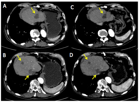 A 71-year-old male affected by colorectal cancer with liver metastasis, subjected to 6 cycles of Bevacizumab-based chemotherapy and 10 hyperthermia sessions on the abdomen as second-line. Baseline Multidetector Contrast Enhancement Computed Tomography (MDCT) (A,B) showed metastasis in the II and VIII segment of the liver and caudate lobe (maximum diameter: 47 mm, yellow arrows). Timepoint-1 MDCT (C,D) evaluation demonstrated stable size of liver metastasis (maximum diameter: 44 mm, yellow arrows). According to mRECIST, patient was classified as SD. Ca19.9 and Carcino-Embryonic Antigen (CEA) values evaluated at baseline were 99 UI/mL and 65 ng/mL, respectively; while Ca19.9 and CEA values evaluated at timepoint-1 were 81 UI/mL and 60 ng/mL, respectively. Side effects reported were limited to nausea and mild position-related pain during HT sessions.