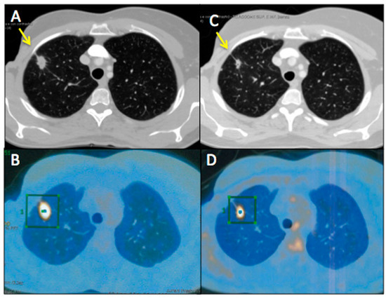 A 55-year-old female affected by breast cancer with lung metastasis, subjected to 12 cycles of Bevacizumab-based chemotherapy and 24 hyperthermia sessions on the thorax, as first-line. Baseline Multidetector Contrast Enhancement Computed Tomography (MDCT) (A) showed metastasis in the superior right lobe of the lung (diameter: 17 mm × 12 mm, yellow arrow), confirmed by the increased 18F-Fluorodeossiglucose (18F-FDG) uptake on Positron Emission Tomography/CT (PET/CT) images in the same sites (green square, B). Timepoint-2 MDCT (C) evaluation demonstrated size decrease of lung metastasis (diameter 14 mm × 7 mm, yellow arrow) with 18F-FDG uptake decrease on PET/CT images (green square, D). According to mRECIST, patient was classified as PR. Ca15.3 and CEA values evaluated at baseline were 830 UI/mL and 135 ng/mL, respectively; while Ca15.3 and CEA values evaluated at timepoint-2 were 115 UI/mL and 40 ng/mL, respectively. Side effects reported were limited to asthenia and peripheral sensory neuropathy.