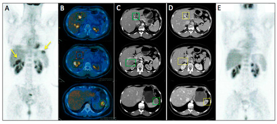 A56-year-old female affected by ovarian cancer with liver and spleen metastasis, already treated with 12 cycles of Bevacizumab-based chemotherapy and 24 hyperthermia sessions on the abdomen, as first-line. Baseline MDCT (C) showed metastasis in III and IV segment of the liver (maximum diameter: 77 mm, green squares) and in the upper spleen (maximum diameter: 61 mm, green square). Baseline whole body 18F-FDG PET/CT (A) confirmed liver and spleen involvement by the increased 18F-FDG uptake (yellow arrows) detectable also on axial fused PET/CT images (B) in the same sites (green and red squares). Timepoint-2 MDCT (D) evaluation demonstrated significant size decrease of liver and spleen metastasis (yellow squares) with no evidence of 18F-FDG uptake on whole body PET/CT (E). According to mRECIST, patient was classified as CR. Ca125 value evaluated at baseline was 790 UI/mL; while Ca125 value evaluated at timepoint-2 was 12 UI/mL. Side effects reported were limited to asthenia and high blood pressure.