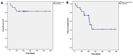 (A) Overall Survival (OS), defined as the time from the start of treatment until the date of death; (B) Time to Progression (TTP), assessed as the time from the start of treatment until progression of disease or death. The mean OS was 497 days (95% CI: 414–580 ± 42.3) while the mean TTP was 339 days (95% CI: 229–449 ± 56).