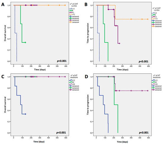 The main result of our study concerned the positive association we found between the percentage of responders and the number of chemotherapy cycles (p = 0.015) and HT sessions (p < 0.001) performed, and the significantly influence of OS (p < 0.001) and TTP (p < 0.001), as showed in Figure 6.