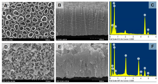 Field emission scanning electron microscopy (FE-SEM) and EDS analysis of the nanotube layer (A–C) and precalcified nanotube layer (D–F) on a Ti mesh.