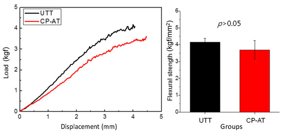 To evaluate the effects of cyclic precalcification on the flexural strength of Ti mesh, three-point bending tests were performed for the samples of each Ti mesh group (n = 3). Figure 4 shows the load deflection curves and mean flexural strength of each group. The mean flexural strength values were 4.15 ± 0.24 kgf/mm2 in the untreated Ti mesh (UTT) group, and 3.69 ± 0.55 kgf/mm2 in the precalcified anodized Ti mesh (CP-AT) group. There was no significant difference between the two groups (p > 0.05).