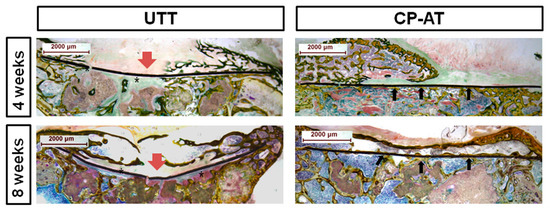 To observe the bone apposition on Ti mesh, Ti mesh-defect biopsies were perpendicularly sectioned to the plane of the Ti mesh through the center point. Figure 5 represents the histological images of these sections of UTT and CP-AT groups at four and eight weeks post-operation. As shown in the image, the UTT group exhibited deformation of the Ti mesh at both time points (red arrows). The UTT mesh tended to collapse into the defect, which did not occur in the CP-AT group. Additionally, the UTT mesh seemed to be covered mostly by soft tissue intervention, and a thin layer of new bone formed separately underneath this soft tissue. Another new bone layer was observed in contact with CP-AT mesh, even in the center of the mesh. In both two groups, over-growth of bone formed on the Ti meshes. Bone grew on the UTT mesh as small pieces and was invaded by connective tissue. In the CP-AT group, a trabecular laminate covered partly on the mesh surface at four weeks, and completely at eight weeks.