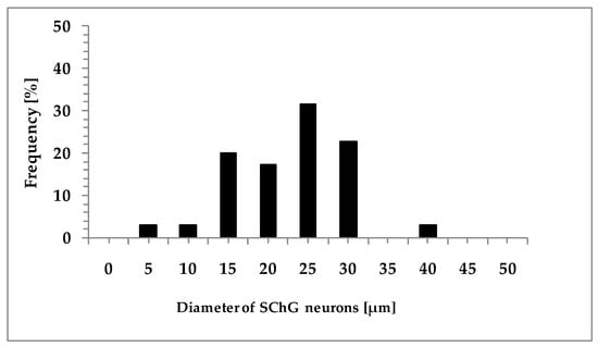 The perikarya were divided into two subclasses according to diameter: small (<25 µm in diameter; mean 17.4 ± 6.0) and large (>25 µm in diameter; mean 29.6 ± 5.4; Figure 8). Their size was measured using CellSens Dimension image analyzing software.