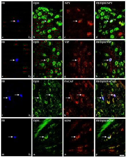 Representative images of sympathetic chain ganglia skin-projecting neurons in porcine skin hind leg. The arrow indicates Fast blue-positive (FB+) skin perikaryon containing examined substances. All the images are taken separately from blue (FB+ (a,e,i,m)), green (DβH+ (b,f,j,n)) and red (positive for: NPY (c); VIP (g); PACAP (k); and SOM (o)) fluorescent channels. Microphotographs d,h,l,p showing the over position of all three channels simultaneously. In L6 ganglion, FB+ small-sized neurons (a,e) which were simultaneously DβH+ (b,f) as well as NPY+ (c) and VIP+ (g). Two small-sized FB+ neurons (i) containing simultaneously DβH (j); and PACAP (k) in S1 SChG. Visible one FB+ small-sized neuron (m) containing DβH (n) and SOM (o) in S2 SChG. Scale bar = 50 µm.