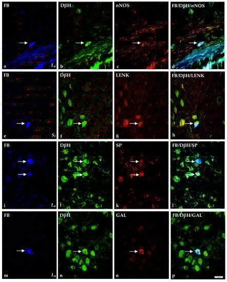 Immunohistochemistry revealed that FB+/DβH+ small-sized cells stained for SOM, NPY and GAL were most numerous in L4, containing PACAP and LENK in L5, while the cells immunorective for FB+/DβH+/VIP+ (Figure 5e–h) and FB+/DβH+/SP+ in L6. In the case of large-sized neurons, FB+/DβH+/nNOS+ cells belonged to the numerous population in L4, FB+/DβH+/PACAP+, FB+/DβH+/VIP+, FB+/DβH+/NPY+, FB+/DβH+/LENK+ and FB+/DβH+/GAL+ in L5, and FB+/DβH+/SOM+ and FB+/DβH+/SP+ in L6. Additionally, the percentage of FB+/DβH+/SOM+ and FB+/DβH+/NPY+ small-sized neurons decreased in the caudal direction. Detailed data on the neurochemical phenotypes characteristic of skin-projecting neurons in lumbar SChG are present in Table 1.