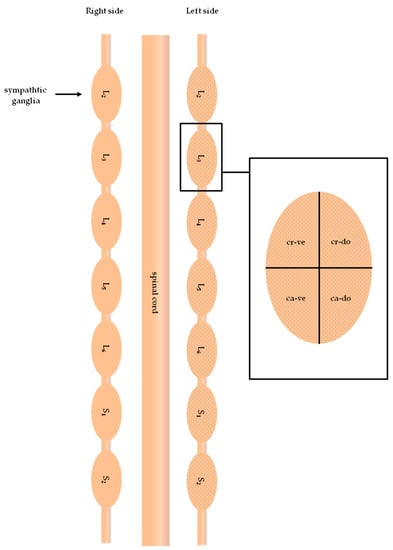 There are other interesting observations in terms of the distribution pattern of the porcine skin-innervating neurons within subdomains of the studied ganglia, defined by ganglion geometry (i.e., the arrangement of its longest and shortest axis). It has been found that small-sized neurons were primarily found in the caudo-dorsal subdomain of sacral SChG, whereas the majority of large-sized neurons were found in the cranio-dorsal subdomain of lumbar and sacral SChG. The somatotopic distribution of sympathetic innervating different organs in pig ganglia has been observed by several authors [,,,]. Moreover, a cranio-caudal somatotopic organization, in reference to skin-projecting dorsal root ganglia neurons supplying the porcine hindlimb, has previously been postulated by Kozłowska et al. [].