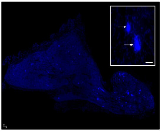 As revealed by the retrograde tract-tracing procedure, the SChG neurons innervating skin of the porcine hind leg were distributed in the left lumbar (L2–L6) and sacral (S1–S2) SChG (Figure 1).