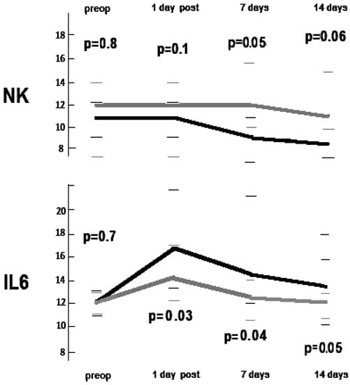 - Baigrie, R.J.; Lamont, P.M.; Dallman, M.; Morris, P.J. The release of interleukin-1 beta (IL-1) precedes that of interleukin 6 (IL-6) in patients undergoing major surgery. Lymphokine Cytokine Res. 1991, 10, 253–256. [Google Scholar] [PubMed]