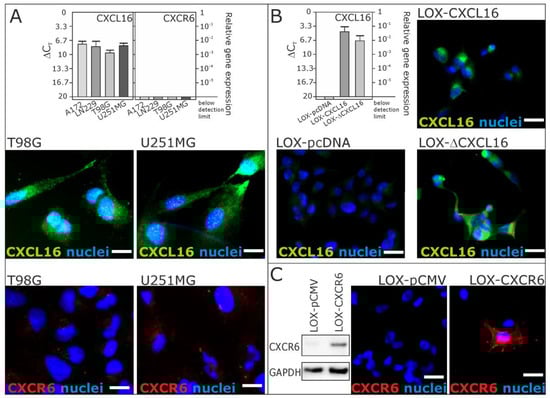 Expression of CXCL16 and CXCR6 mRNA and protein in glioblastoma cells and stably transfected LOX melanoma cell clones by quantitative reverse transcription polymerase chain reaction (qRT-PCR) and immunocytochemistry (ICC). (A) Expression of CXCL16 and CXCR6 was investigated in glioblastoma cell lines A172, LN229, T98G and U251MG (for biological independent results of A172 and T98G, compare also []). CXCL16 was detected at moderate to high extends, whereas CXCR6 was undetectable or yielded just background staining; (B) expression of CXCL16 was investigated in clones from natively CXCL16-negative, CXCR6-negative LOX melanoma cells. While the LOX-pcDNA clone was CXCL16 negative, the LOX-CXCL16 clone showed CXCL16 at the mRNA and protein level. A C-terminally truncated version of CXCL16 (in LOX-ΔCXCL16 cells) was also detectable at the mRNA and protein level (for verification of truncation, see []); (C) Expression of CXCR6 was investigated in LOX melanoma cell clones. While the LOX-pCMV clone was CXCR6 negative, a LOX-CXCR6 transfected clone yielded positive staining for CXCR6 and a specific signal at about 43 kDa in Western blot experiments. Values of qRT-PCR are shown as ΔCT, meaning that a 3.33 higher ΔCT indicates a 10-fold lower mRNA expression. n = 3 independent experiments; examples shown for immunocytochemistry. Scale bars indicate 20 µm, respectively.