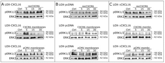 In the next step, we stimulated stably CXCL16 expressing LOX melanoma cells (LOX-CXCL16) with recombinant CXCR6 and observed again an activation of ERK1/2 (Figure 3A, upper part). Additionally, we extracted membranes from stably CXCR6 expressing LOX cells (LOX-CXCR6) and used these for stimulations yielding also the activation of ERK1/2 signaling, while stimulation with control membranes from LOX-pCMV failed to induce phosphorylation. As a control, we repeated stimulation experiments with LOX-pcDNA control cells that are negative for CXCL16 (and also CXCR6), and neither recombinant, nor membrane expressed CXCR6 could activate ERK1/2 signaling (Figure 3B). Furthermore, we stimulated LOX melanoma cells stably expressing a CXCL16 variant that lacks the cytoplasmic tail due to truncation (LOX-ΔCXCL16) with recombinant and membrane expressed CXCR6, as well as control membrane fractions and did not observe any ERK1/2 phosphorylation either (Figure 3C). As a further control, to exclude unspecific reaction of a recombinant receptor preparation, we stimulated LOX-CXCL16 and LOX-pcDNA cells also with recombinant CX3CR1. CX3CR1 is the receptor for the transmembrane chemokine CX3CL1, which is not expressed by LOX clones. CX3CR1 does not bind to CXCL16, so that recCX3CR1 may serve as an unrelated recombinant receptor control. Accordingly, stimulation with recCX3CR1 did not yield any activation of the ERK1/2 pathway (compare Figure S1).