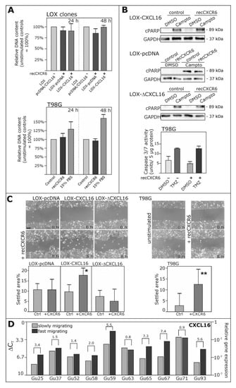 To investigate which biological consequences might result from the reverse signaling of the CXCL16-CXCR6 axis, we first referred to the effects observed with inverse signaling in glioma cells [] and tested the proliferative and anti-apoptotic effects in LOX-CXCL16 and corresponding control clones. However, in these CXCL16-transfected melanoma cells, we did not observe any regulation of proliferation upon stimulation with recombinant CXCR6 (Figure 4A), nor could we detect less cleavage of poly(ADP ribose) polymerase (PARP, Figure 4B) after induction of apoptosis with 0.1 µg/mL camptothecin. Additionally, we did not observe any proliferative or anti-apoptotic effects in endogenously CXCL16-expressing glioblastoma cells (Figure 4A,B).