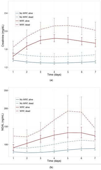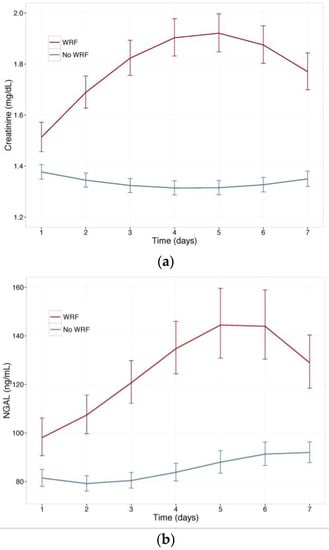 (a) Change in serum creatinine in patients with and without WRF; (b) Change in plasma Neutrophil Gelatinase-Associated Lipocalin (NGAL) in patients with and without WRF. Least square means, with 95% confidence intervals, WRF: worsening renal function, defined as a creatinine increase of ≥0.3 mg/dL by day 4.