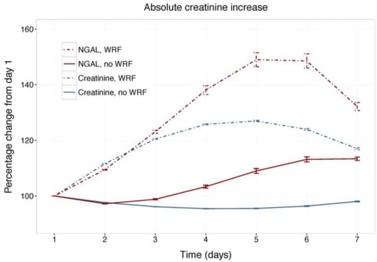 Relative changes in serum creatinine and NGAL. Least square means with 95% confidence intervals. WRF: worsening renal function, defined as creatinine increase of ≥0.3 mg/dL by day 4.
