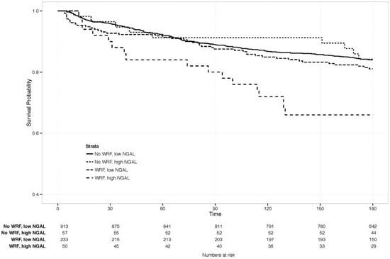 180-day survival in patients with vs. without WRF, high vs. low NGAL change. Creat: creatinine. NGAL: Neutrophil Gelatinase-Associated Lipocalin. High vs. low, defined as an NGAL increase of ≥1 standard deviation (≥88 ng/mL increase).