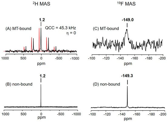 Solid-state magic-angle spinning (MAS) NMR spectra of analog 3, microtubule-bound (A,C) or dispersed in PIPES buffer (B,D). (A) Experimental (black) and simulated (red; shifted left for clarity) 2H spectra with the calculated quadrupolar parameters displayed, 81,910 scans at 0.5 s repetition; (B) Experimental 2H spectrum; (C) Experimental 19F spectrum, 2560 scans at 50 s repetition; (D) Experimental 19F spectrum. All the spectra were acquired at ambient temperature with Hahn-Echo without proton decoupling and the isotropic resonances are marked on the spectra.