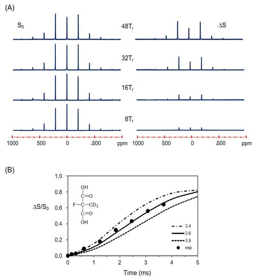 Though the high-γ of 19F is helpful to enhance the NMR sensitivity and increase the range of measurable distances by REDOR, its proximity to 1H resonance frequency often makes it difficult to observe fluorine while performing proton decoupling with a conventional spectrometer. A strategy of performing REDOR experiments with a two-channel spectrometer for biological solids was previously developed for a 2H-19F spin pair []: deuterium (X) was observed without 1H decoupling as the isotope has no directly bonded protons and possesses comparatively weak dipolar couplings to protons, while the high-frequency channel (H/F) of the conventional double resonance spectrometer was used for 19F-spin inversion. First, we used a synthetic compound, 2-fluoro-2-methyl-d3-malonic acid ([2-F,2-Me-d3]MA), and its intramolecular 2H-19F spin pair (d ~ 3.6 Å) as a reference model for testing the feasibility of implementing 2H{19F} REDOR to our 400 MHz wide-bore spectrometer equipped with only two-channel hardware, H/F and X. By employing a pulse sequence shown in Figure S3 [,], distortion-free full-echo deuterium signals (S0) and difference signals (ΔS) were successfully acquired without proton decoupling (Figure 4A). SIMPSON analysis for the signals successfully reproduced a single distance of 3.6 (±0.2) Å for the spin pair (Figure 4B).