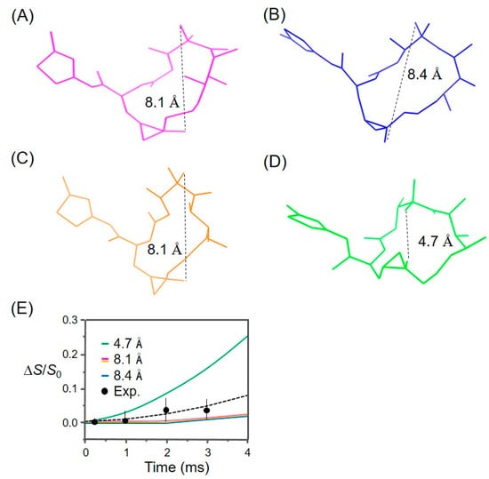 Figure 6 shows the representative conformations of tubulin-bound epothilones reported in the literature. Our experimental REDOR data (ΔS/S0) were compared with the SIMPSON curves calculated for the corresponding 2H-19F spin pairs in each structure, of which only the shorter distances were depicted by dotted lines. The comparison likely indicates that the experimental data deviates from the curve calculated for the conformation in Figure 6D, while being consistent with the other three structures, which are very similar in the relevant distances (Figure 6A–C). This suggests that the macrolide of microtubule-bound epothilone B may have a different conformation from the one of tubulin-bound epothilone A in tubulin 2D sheets []. SIMPSON calculations assumed that the observed nucleus (2H) is located at the center of three deuterium atoms, the distance between the two CD3-groups being fixed at 2.7 Å. Additionally, it is also assumed that the source of dephasing 19F is located near the center of H2F triangle in CH2F-group, as the –CD3 and –CH2F undergoing fast C3-type rotations. These assumptions are used in common in the literature [,], and are also consistent with the molecular dynamics information obtained from our 2H and 19F signals (see below).
