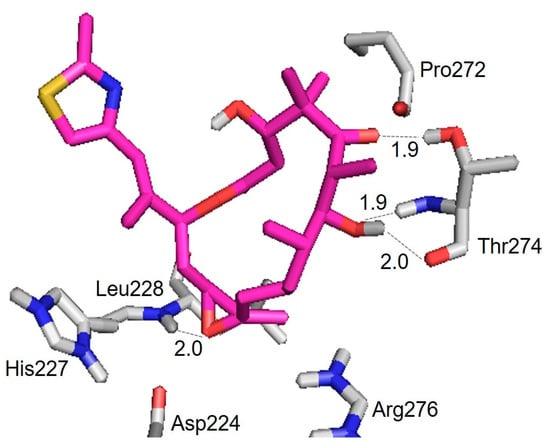 Figure 7 shows the structure of an epothilone B conformer epoB(TUB)_1q5d docked to a tubulin dimer (binding energy ≅ −7.91 kcal/mol) and the hydrogen bond interactions with the amino residues in β-tubulin (Table 2). Its binding mode is somewhat different from the ones generally found for epothilone A conformers in the literature [,]: the polar atoms O(5) and O(7), in lieu of O(1), made hydrogen bonding to OH(Thr274) and NH(Thr274), respectively, in the M-loop. The polar atom O(epoxide), in lieu of O(7), contacted NH(Leu228) of the H7 helix. However, when another docking experiment was carried out for epothilone A, all of the important hydrogen-bonding contacts were reproduced between the polar atoms of epothilone A and the amino residues of β-tubulin at a low binding energy (−6.11 kcal/mol) (Figure S7) []: i.e., residues in the M-loop of β-tubulin formed hydrogen bonding with the ligand between O(1) and NH(Thr276) at 2.0 Å, and O(3)H and NH(Gln281) at 2.1 Å. The carbonyl (C=O) of Asp226 in the H7 helix made a contact to O(7)H at 1.9 Å. A molecular modeling study on the epothilone B/tubulin interaction was reported by adopting an initial conformation obtained from the single crystal X-ray structure of pure epothilone B []: two important hydrogen bondings were found between Leu228(NH) and O, and Thr274(NH) and O(7), which is consistent with our results (Table 2).