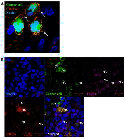 2.5. CD15s Expression Was Localised at the Peripheral Adhesion Sites of Cancer Cell–Brain Endothelium