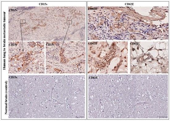 Jassam, S.A.; Maherally, Z.; Smith, J.R.; Ashkan, K.; Roncaroli, F.; Fillmore, H.L.; Pilkington, G.J. CD15s/CD62E Interaction Mediates the Adhesion of Non-Small Cell Lung Cancer Cells on Brain Endothelial Cells: Implications for Cerebral Metastasis. Int. J. Mol. Sci. 2017, 18, 1474. https://doi.org/10.3390/ijms18071474