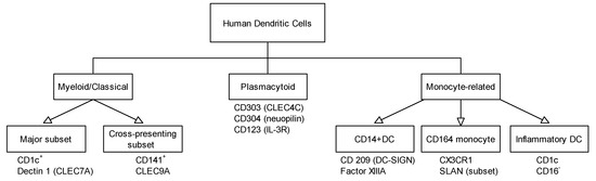 - Mildner, A.; Jung, S. Development and function of dendritic cell subsets. Immunity 2014, 40, 642–656. [Google Scholar] [CrossRef] [PubMed]