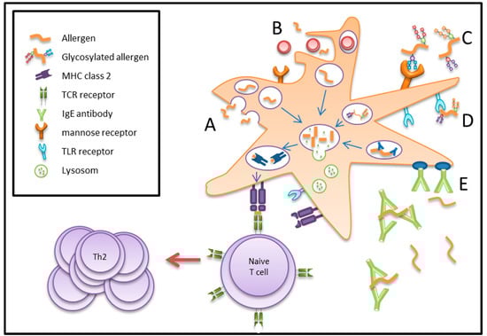 In the context of allergic diseases, it is largely unknown what the major differences between healthy and atopic individuals are when being exposed to allergens and sampling by DCs starts. Allergen uptake and processing by DCs is a pivotal step in the induction of Th2 responses. It is known that human DCs are involved in the Th2 sensitization process against common allergens in individuals with genetic predisposition [57]. The Western life style has been described as a reduced exposure of environmental microbial load to the human immune system. As a consequence, this absence of microbial stimulation could explain why DCs are not instructed to produce IL-12 and fail to counteract Th2 responses. However, other studies suggest that there is no difference in IL-12 production in moDCs between atopic and non-atopic individuals [58]. A third theory investigated whether allergen exposure levels contribute to an allergic immune response. Chronic low-level exposure to inhaled allergens can lead to decreased levels of DCs continuously migrating to the lymph nodes and inducing sustained TCR ligation at low stimulator/responder ratios, conditions known to induce Th2 responses [59,60]. The first encounter of DCs with allergens can be investigated by using monocyte-derived DCs (moDCs) obtained from healthy and allergic individuals, respectively. Peripheral blood monocytes are cultured for 7 days with IL-4 and granulocyte macrophage-colony stimulating factor (GM-CSF) and then exposed to fluorescent-labelled allergens. In vitro, moDCs have been shown to upregulate surface markers (i.e., CD80, CD83, CD86, and HLA-DR) after stimulation with lipopolysaccharides [61,62] and major allergens from birch pollen (Bet v 1, [63,64,65]), peach (Pru p 3, [66]), peanut (Ara h 1, [67]), house dust mite (Der p 1, [68]), and grass pollen (Phl p 5, [69]). When moDCs were incubated with purified HDM and birch pollen allergens (Der p 1 and 2, Bet v 1) and subsequently cultured with autologous T cells, they induced predominantly Th2 responses only in the allergic donors, despite similar IL-12 expression levels in both study groups [70,71]. Other studies showed that high affinity IgE receptor FceRI was upregulated in CD1a+ Langerhans cells in patients with atopic dermatitis and in DCs in the nose and bronchi of allergic patients [24]. However, recent studies showed that IgE-facilitated uptake is not necessary for Bet v 1 internalization of moDCs [69,72] and blocking endocytic pathways inhibits Bet v 1 uptake [72]. Interesting results regarding allergen uptake come from Al-Ghouleh et al. They showed that the uptake of the glycosylated allergen Der p 1 is carbohydrate-dependent and was performed via the mannose receptor. Reduction in the uptake due to allergen deglycosylation indicates that glycan moieties play a crucial role in their recognition by innate immune cells, contributing to a downstream activation of Th2 cells and IgE production [73].
