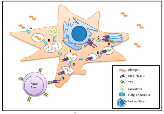 Subsequent processing and lysosomal degradation of allergens is crucial, and the most resistant peptides are then being presented via MHC II molecules to the T cell receptor ((TCR); Figure 3). The antigens sampled by DCs are finally processed in late endosomal or lysosomal structures that are enriched in proteolytic enzymes and disulphide reductases [74]. These proteases are activated by a rather low pH environment. This degradation process is tightly regulated, and includes asparaginyl endopeptidase and cathepsin S. Cathepsin S, B, H, and L are also important for promoting peptide MHC II complex assembly. The class I-associated invariant chain peptide (CLIP) remains bound to the MHC II peptide binding groove. Later on, CLIP is released to facilitate the binding of antigenic peptides to the MHC II, and finally the antigenic peptide is guided to the surface to be presented to naïve CD4+ T cells [74].