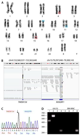 Analysis of the t(4;15)(q31;q22) reciprocal chromosomal translocation. (A) Conventional karyotyping showing 46,XX,t(4;15)(q31;q22), outlined in red and t(9;11)(p22;q23), outlined in blue. Chromosome analysis was performed on 20 G-banded metaphase cells from multiple unstimulated cultures. Both translocations were present in all cells examined. (B) Breakpoint analysis of the novel fusion transcript produced by the t(4;15) chromosomal translocation. TMEM154 and RASGRF1 form a chimeric mRNA transcript with the breakpoint indicated by the black arrow. (C) Sanger sequencing chromatogram showing the transcribed sequence surrounding the breakpoint. (D) PCR analysis of and TMEM154-RASGRF1, RASGRF1-TMEM154, and TMEM154 transcripts. PCR was performed on t(4;15) acute myeloid leukemia (AML) cells (lanes 1–4) and bone marrow mononuclear cells (BM-MNCs) from a healthy donor (lanes 5–8). Bands correspond to a 445 bp product amplified fromTMEM154-RASGRF1 mRNA (lanes 1 and 5), a 589 bp product amplified from TMEM154-RASGRF1 mRNA (lanes 2 and 6), and a 445 bp product amplified fromTMEM154 mRNA (lanes 4 and 8). No product was amplified using primers corresponding to RASGRF1-TMEM154 mRNA (lanes 3 and 7).