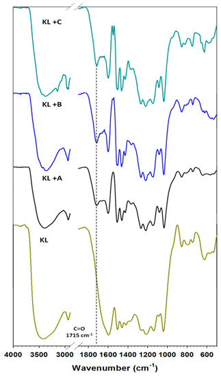 FTIR spectra of kraft lignin (KL) and activated lignin in selected ionic liquids: [C4im][HSO4] (KL+A), [Et3NH][HSO4] (KL+B) and [C4C1im][MeSO3] (KL+C). Dashed line: band derived from the carbonyl group.