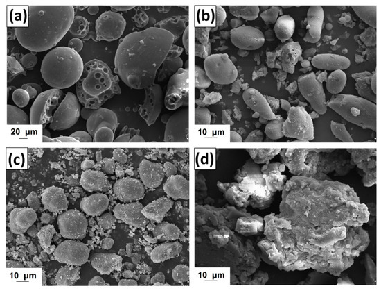 Scanning electron microscopy (SEM) images of lignin (a) and lignins activated by [C4im][HSO4] (b), [Et3NH][HSO4] (c) and [C4C1im][MeSO3] (d).