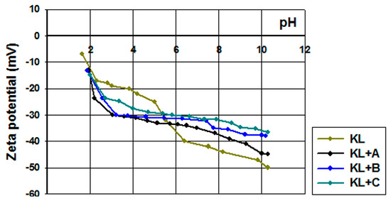 Zeta potential vs. pH for kraft lignin and activated lignins in selected ionic liquids: [C4im][HSO4] (KL+A), [Et3NH][HSO4] (KL+B) and [C4C1im][MeSO3] (KL+C).