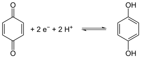 Pure kraft lignin had negative surface charge over the measured pH range. For this reason, the biopolymer has a wide range of functional groups that can dissociate, for example hydroxyl groups, carboxyl groups and the very important carbonyl groups [62,63]. With decreasing pH of solution the total quantities of H+ and OH− ions changed, having an effect on the biopolymer surface. According to the mechanism proposed by Dong et al. [63], the carbonyl groups dissociate and form a quinone-hydroquinone system. This is very important in electrochemistry, because this formation can transfer protons and electrons in electrochemical materials [64]. Kraft lignin attains electrokinetic stability above pH = 5, where the zeta potential is lower than −30 mV. In general the activated lignin surface also had negative charge in the measured pH range. It is for this reason that all of them have many functional groups that tend to dissociate in the solution used. Two of them reach electrokinetic stability earlier than kraft lignin, but on the other hand the biopolymer activated in [C1C4im][MeSO3] had less favorable properties. These values of zeta potential proved that the activation process of lignin with selected ionic liquids increases the quantity of dissociative functional groups. Potentially this procedure increases the quantity of carbonyl groups by oxidation and depolymerization of biopolymer. Moreover, based on the simple example of 1,4-benzoquinone, it is possible to transfer protons and electrons by reduction in a low pH range (see Figure 4). This mechanism of electron transfer was proposed by Milczarek and Inganas [64]. They suggest that lignin fragments like 1,2-benzoquinone could be reversibly oxidized and reduced. All of this evidence confirmed that the activation performed in ionic liquids was effective and improved the electrokinetic properties of the biopolymer.