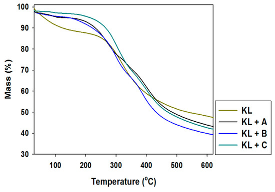 Thermogravimetric curves of kraft lignin (KL) and activated lignins by selected ionic liquids: [C4im][HSO4] (KL+A), [Et3NH][HSO4] (KL+B) and [C4C1im][MeSO3] (KL+C).