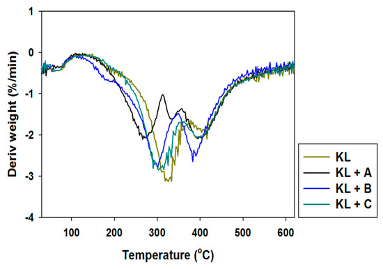 Differential thermogravimetry (DTG) curves of kraft lignin and activated lignins by selected ionic liquids.