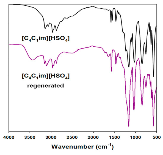 A proposed ionic liquid regeneration procedure was developed on the basis of literature reports [44]. This method was performed for all of the ILs used, but only the results for [C4im][HSO4] are shown here (Figure 7).