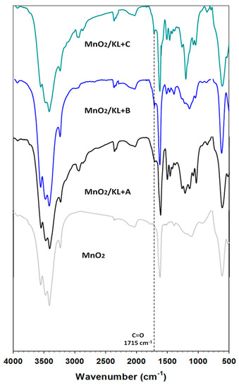 FTIR spectra of manganese oxide and MnO2/lignin hybrid materials based on activated biopolymer with using selected ionic liquids: [C4im][HSO4] (MnO2/KL+A), [Et3NH][HSO4] (MnO2/KL+B) and [C4C1im][MeSO3] (MnO2/KL+C).