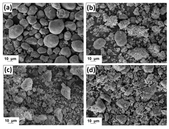 SEM images of manganese oxide (a) and MnO2/lignin hybrid materials based on biopolymer activated by using [C4im][HSO4] (b), [Et3NH][HSO4] (c) and [C4C1im][MeSO3] (d).