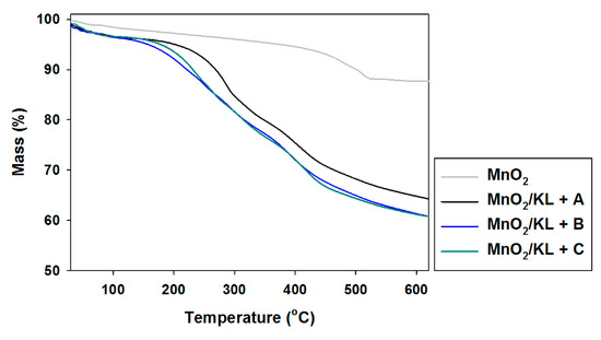 TGA curves of manganese oxide and hybrids obtained by combination of MnO2 and activated lignins using selected ionic liquids: [C4im][HSO4] (MnO2/KL+A), [Et3NH][HSO4] (MnO2/KL+B) and [C4C1im][MeSO3] (MnO2/KL+C).