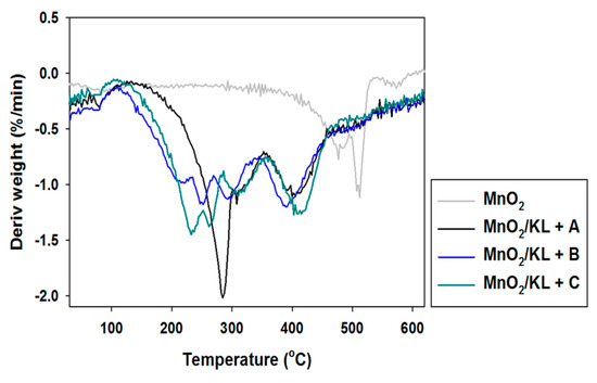 In the examined temperature range there was observed a gentle decrease (almost 40%) in the mass of the products. However the best additive was lignin activated in [C4C1im][MeSO3], which caused thermal degradation to begin near 300 °C, where in the remaining cases it began at 220 °C. Based on the DTG curves (see Figure 12) of the prepared hybrid materials there were observed two or three falls in mass in the investigated temperature range. This situation corresponds to the DTG curves shown in Figure 6, and is characteristic for the presence of the activated biopolymer in the prepared hybrids. In comparison with the TGA curves obtained for activated lignins (Figure 5), combination with manganese dioxide minimally increases the thermal stability of the final materials. Moreover, these results were predictable based on TGA and DTG curves determined for pure lignins and manganese oxide. On the other hand, these materials have poorer thermal stability than the SiO2/lignin hybrids well known from the literature [21,22,23].