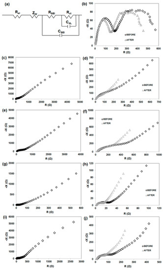 Low potential anodes (e.g., lithium or lithiated graphite) exhibit a tendency to spontaneously react with electrolytes. In case of metallic lithium as well as lithiated graphite it is necessary to include a protective coating, as lithium may grow dendrite crystals on its surface. As a result, it is expected that the electrolyte used for Li-ion batteries will form an SEI which will protect the anode [67]. A similar phenomenon was observed for the presented anode materials. A solid electrolyte interface can be formed after several cycles e.g., on the MnO2/KL+B anode. In contrast the SEI film on a graphite anode is formed during the initial cycle [68,69]. Impedance spectroscopy may be used in order to investigate the passivation of electrodes in a Li-ion battery (Figure 13b,d,f,h,j). Electrochemical impedance spectra (EIS) of electrode|electrolyte|Li were measured before and after 20 cycles (at a current of 50 mA·g⁻1). Two electrode cells were used to record the impedance spectra with the use of an Li counter. The impedance of the interface of lithium was included in the EIS results. It can be observed that the spectra obtained directly following the cell assembly included a semicircle and a linear part. The semicircle may be associated with e.g., polarization resistance or SEI layer formation, whereas the linear part may be attributed to the diffusion of Li ions (in the electrolyte, SEI or the solid electrode). The high diffusion resistance of lithium may be a rate-determining factor in the anode material. The semicircle and long line were present in the impedance spectrum obtained for 1M LiPF6 (in EC:DMC, 1:1) during charge/discharge. However, after charging/discharging one, much smaller semicircle was present in the spectrum.
