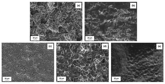The EIS results also show the impedance of the anode interface. Nyquist plots for MnO2|Li cells without activated lignin composition is shown in Figure 13b. Typically, spectra taken immediately after cell assembly consist of two parts in the high-frequency region. On the other hand, the impedance plots consisting of two semicircles may also be attributed to the anode/electrolyte interface (the high-frequency semicircle) and to the cathode/electrolyte interface (the low-frequency semicircle). Confirmation is seen on SEM images (see Figure 14). It is clearly observed that irregularly shaped pores are randomly located on the surface of the electrode spheres (Figure 14a,b,d). A different structure is observed for MnO2/KL+A and MnO2/KL+C (Figure 14c,e )—the change in structure is caused by the ILs used.