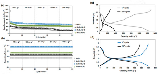 The Nyquist plots (before charging-discharging) for all four electrodes are similar (excluding MnO2—Figure 13b), and show one semicircle in the high–middle-frequency region and an inclined line in the low-frequency region. The diameter of these circles is dependent on the interface contact and charge transfer resistance [49]. The MnO2/KL+C electrode has a clearly smaller diameter of the semicircle compared with MnO2/KL+A. This difference supports the finding that lignin (KL) can facilitate electron and Li-ion transfer and improve electrical conductivity, thus resulting in significant improvement in the electrochemical performance of MnO2 [49]. Moreover the impedance range for pure lignin excluded that electrode from further electrochemical studies (Figure 13c).