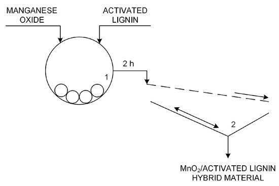 The results of determination of the contents of basic elements are presented in Table 4. The manganese oxide shows low contents of carbon and hydrogen, as expected. The prepared MnO2/lignin hybrid materials have higher contents of carbon, hydrogen and sulfur. The obtained materials were prepared by mixing manganese oxide with activated lignins in an equal mass ratio. This ratio was reflected in the analysis; compared with Table 2 the contents of the basic elements decreased by half. As noted previously in Section 2.1.2, the low values of the elements nitrogen and sulfur came from residual ionic liquid. In summary, these results confirm the successful preparation of functional hybrid materials.